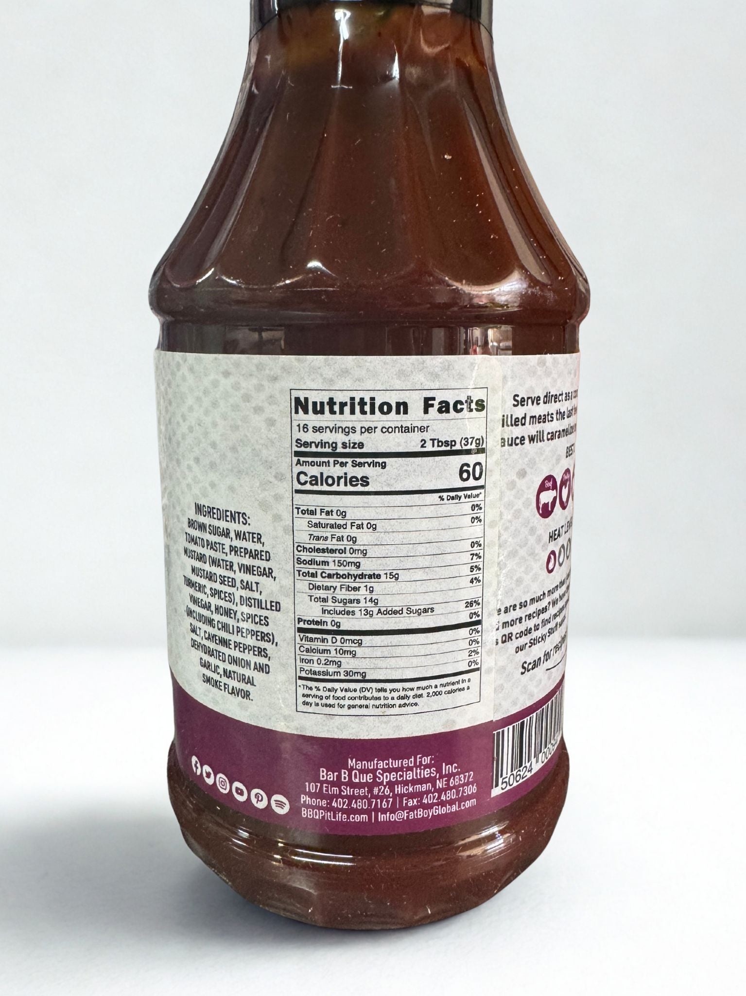Ingredients: Brown sugar, water, tomato paste, prepared mustard (water, vinegar, mustard seed, salt, turmeric, spices), distilled vinegar, honey, spices (including chili peppers), salt, cayenne peppers, dehydrated onion and garlic, natural smoke flavor.
