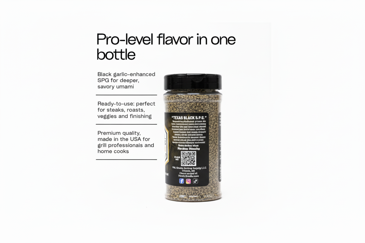 Elevate your culinary creations with Texas Black SPG seasoning! This premium blend of salt, pepper, and garlic is enhanced with the unique addition of black garlic - adding an amazing taste to every dish. Take advantage of this versatile and delicious addition to your cooking routine.